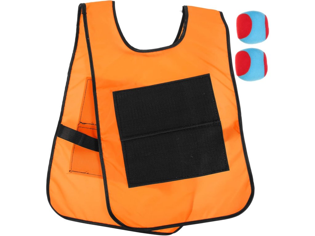 W zestawie znajduje się praktyczna kamizelka zapinana na rzep, która jest lekka, wygodna i przystosowana do aktywnej zabawy. Posiada powierzchnię do gry, na której można łatwo przymocować piłki. Kamizelka przyciąga wzrok i przyciąga uwagę intensywnym kolorem, co dodatkowo zwiększa radość z gry.
