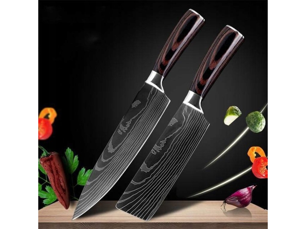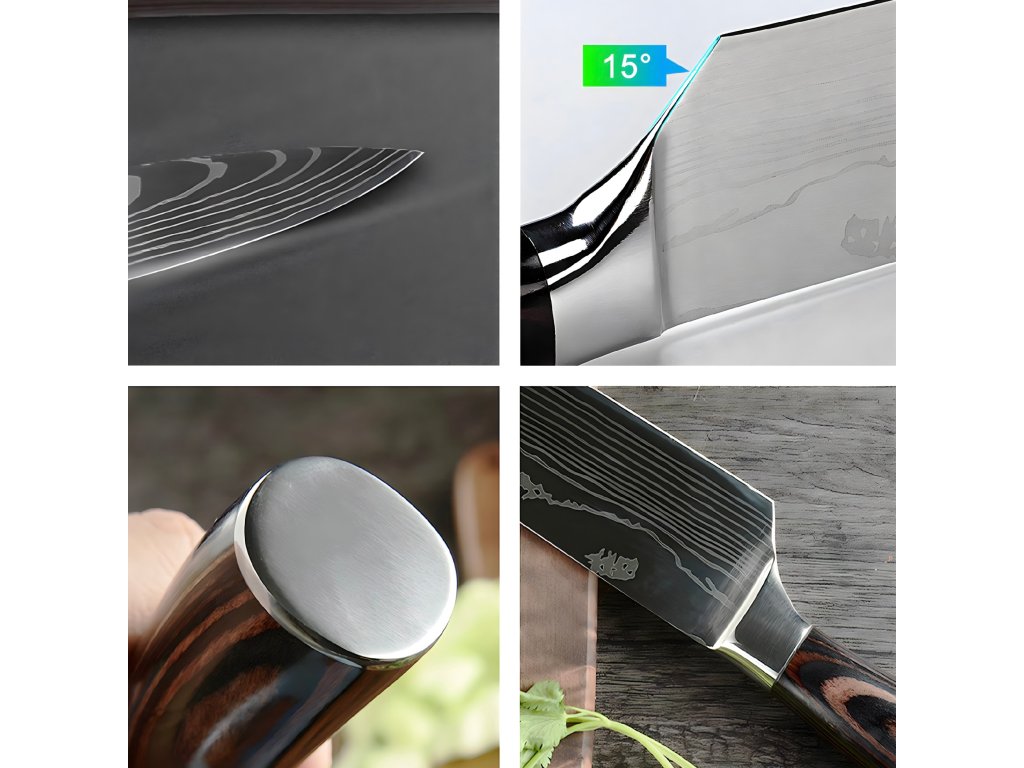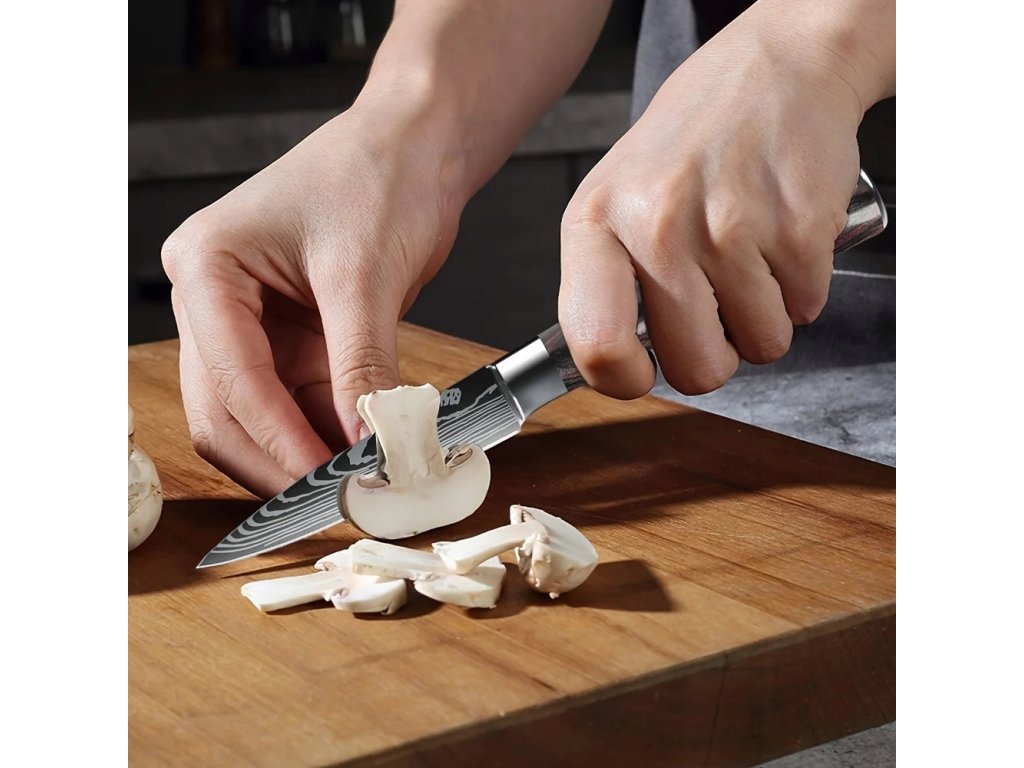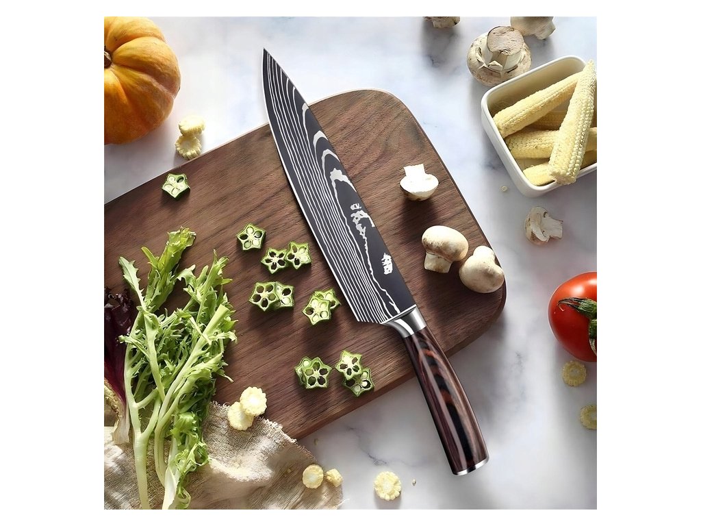 Każdy nóż jest pięknie ozdobiony laserem, co daje efekt stali damasceńskiej i nadaje nożom ekskluzywny wygląd. Ozdoba ta nie tylko podnosi walory estetyczne noży, ale także czyni z nich dzieło sztuki, które będzie ozdobą Twojej kuchni.