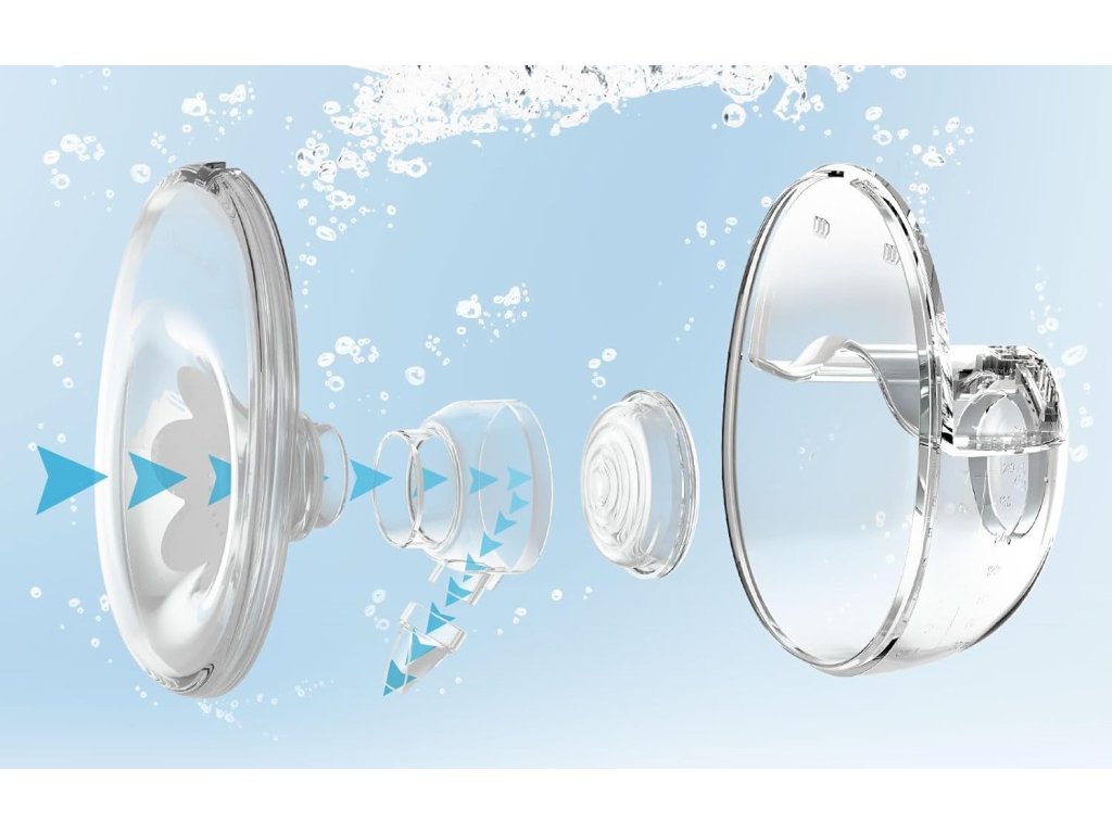 Delikatna technologia ssania gwarantuje maksymalny komfort bez nieprzyjemnego ucisku i bólu. Laktator w kształcie muszli ergonomicznie dopasowuje się do piersi i zapewnia naturalne odczucie ssania. Dzięki temu jest on przyjemny i bezpieczny w stosowaniu, a jednocześnie pomaga zapobiegać podrażnieniom skóry. Materiał jest hipoalergiczny i nieszkodliwy dla zdrowia, co gwarantuje bezpieczne odciąganie pokarmu zarówno dla matki, jak i dla dziecka.