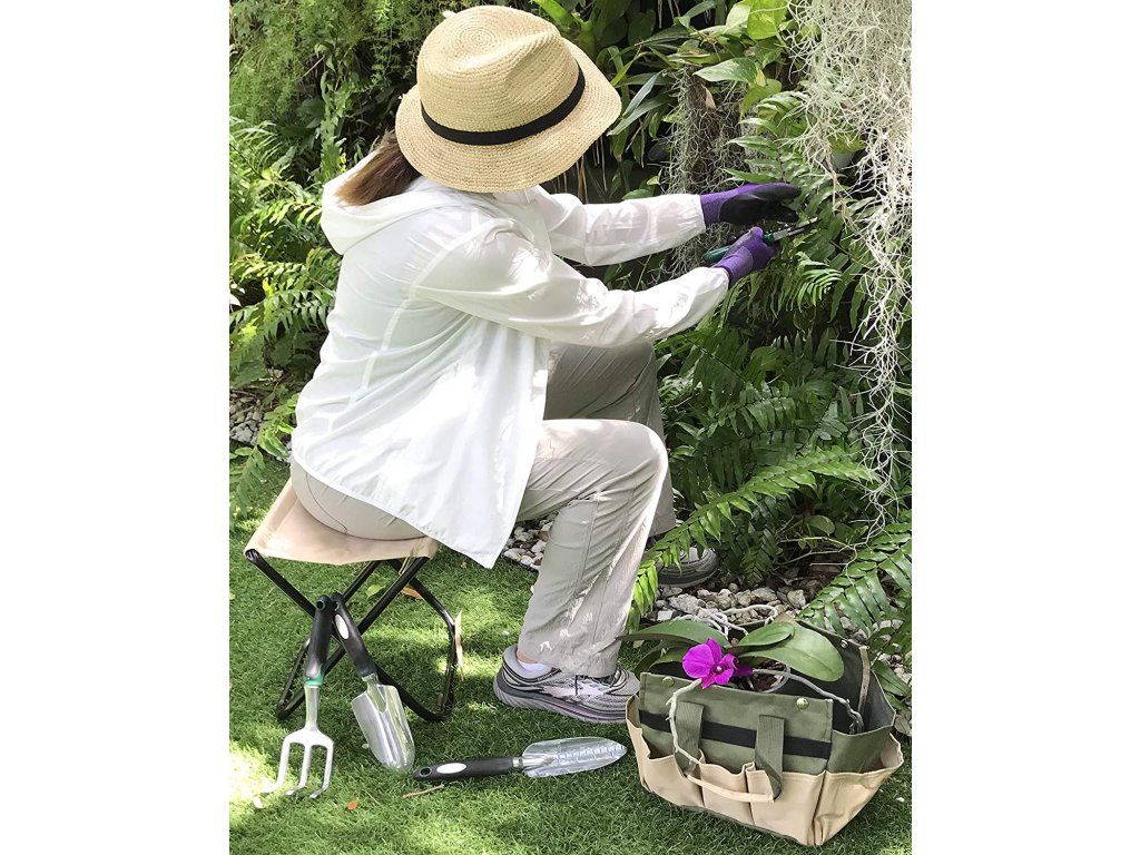WYJĄTKOWE SKŁADANE KRZESEŁKO DO PIELENIA W OGRODZIE Z TORBĄ NA NARZĘDZIA