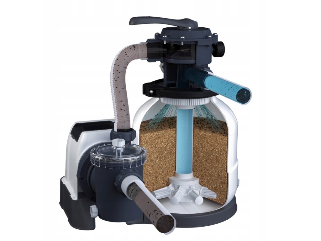 Oryginalna pompa piaskowa do basenu o wydajności 3500 l/h jest wyposażona w 5-pozycyjny uchwyt umożliwiający łatwą zmianę funkcji, zacisk kołnierzowy 360° i duży kosz filtracyjny , który wychwytuje większe zanieczyszczenia.
