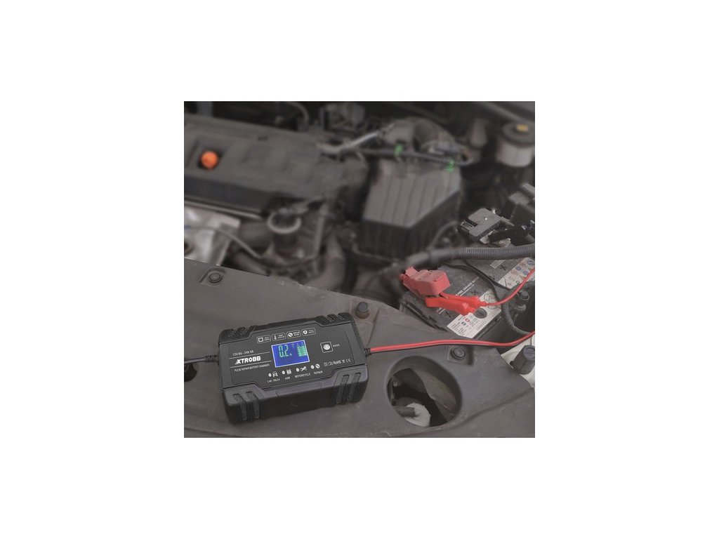 Ta profesjonalna ładowarka do akumulatora samochodowego jest kontrolowana przez wysokiej jakości mikroprocesor, który automatycznie dostosowuje prąd ładowania do napięcia. Posiada funkcję tzw. automatycznego wykrywania napięcia akumulatora (12 V lub 24 V).