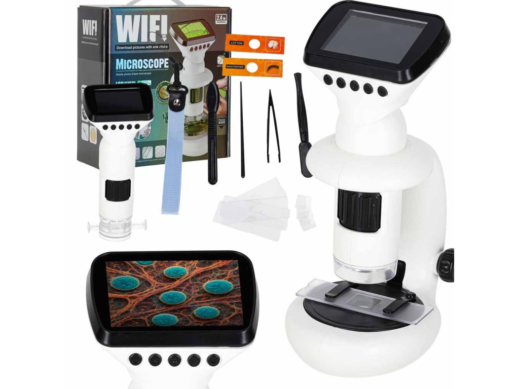 - Wymiary: mikroskop 21 × 9 × 11 cm, mikroskop ręczny 16 × 7,5 × 6 cm