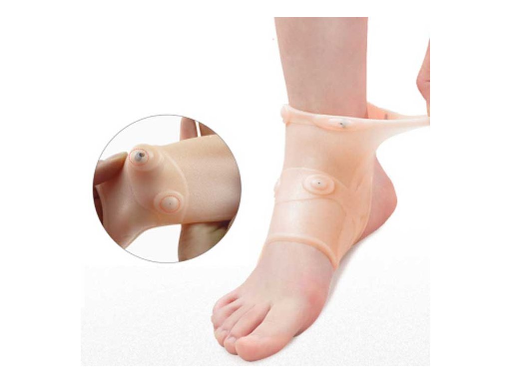 Opaska magnetyczna wykonana jest z elastycznego, oddychającego silikonu, który wzmacnia staw skokowy, zapewnia kompresję, a także ogrzewa staw. Zmniejsza ból związany z przeciążeniem stawów.