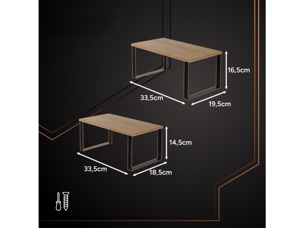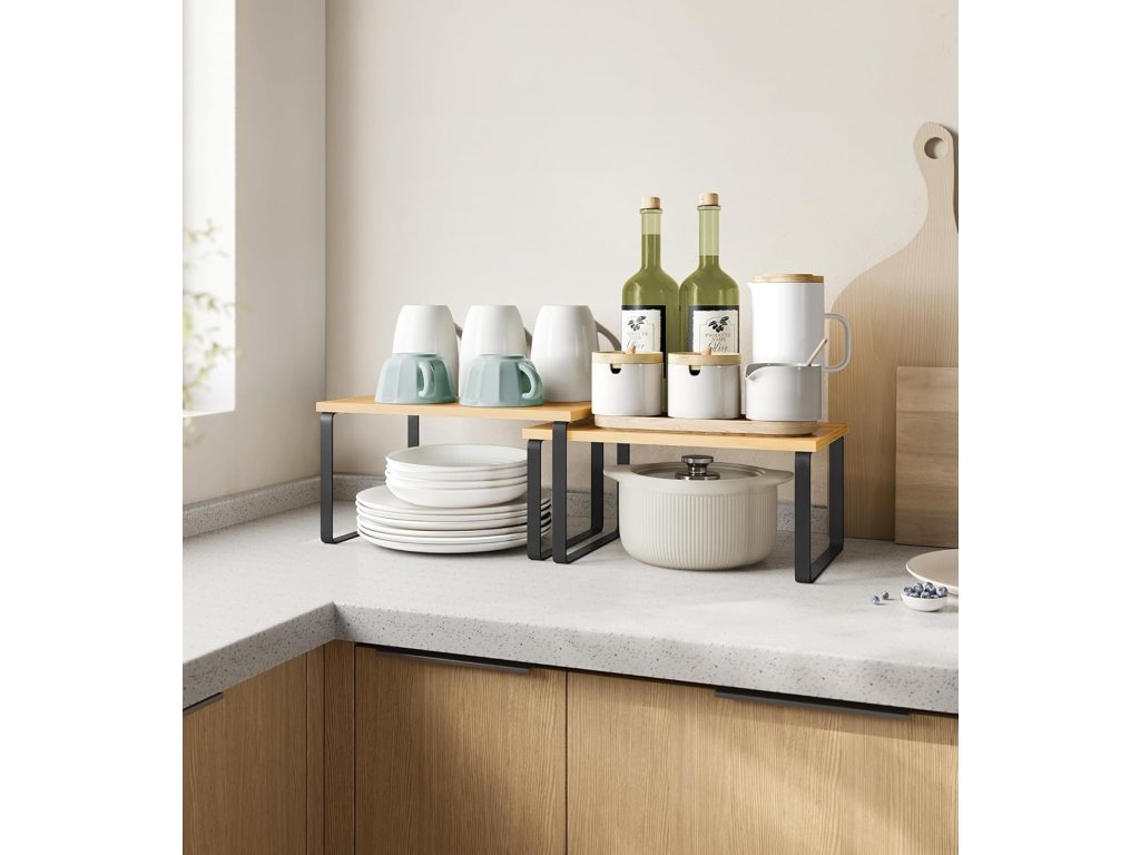 Dzięki dwóm różnym wysokościom (33,5 x 19,5 cm i 33,5 x 18,5 cm), ten zestaw bambusowych półek kuchennych pozwala na różnorodne możliwości aranżacji. Można je stosować jako rozwiązanie warstwowe, ustawiać obok siebie lub w różnych kątach pomieszczenia.