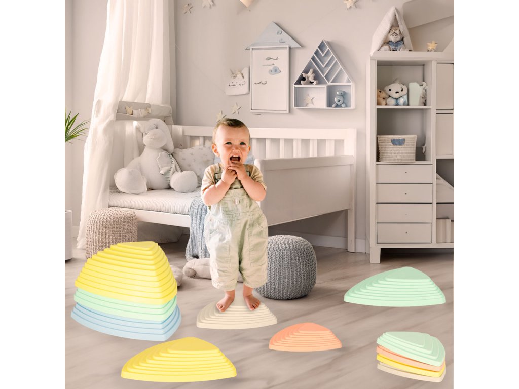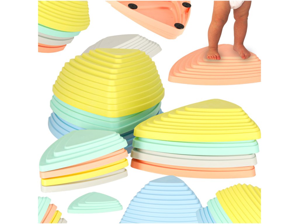 Dzięki różnym kształtom i wysokościom, praktyczna ścieżka sensoryczna – kamienie do balansowania – oferuje nieograniczone możliwości budowania. Dzieci mogą tworzyć własne trasy, spróbować swoich sił w grze „Podłoga to lawa” lub rozwinąć wyobraźnię, grając w przygodowe gry z przeszkodami.