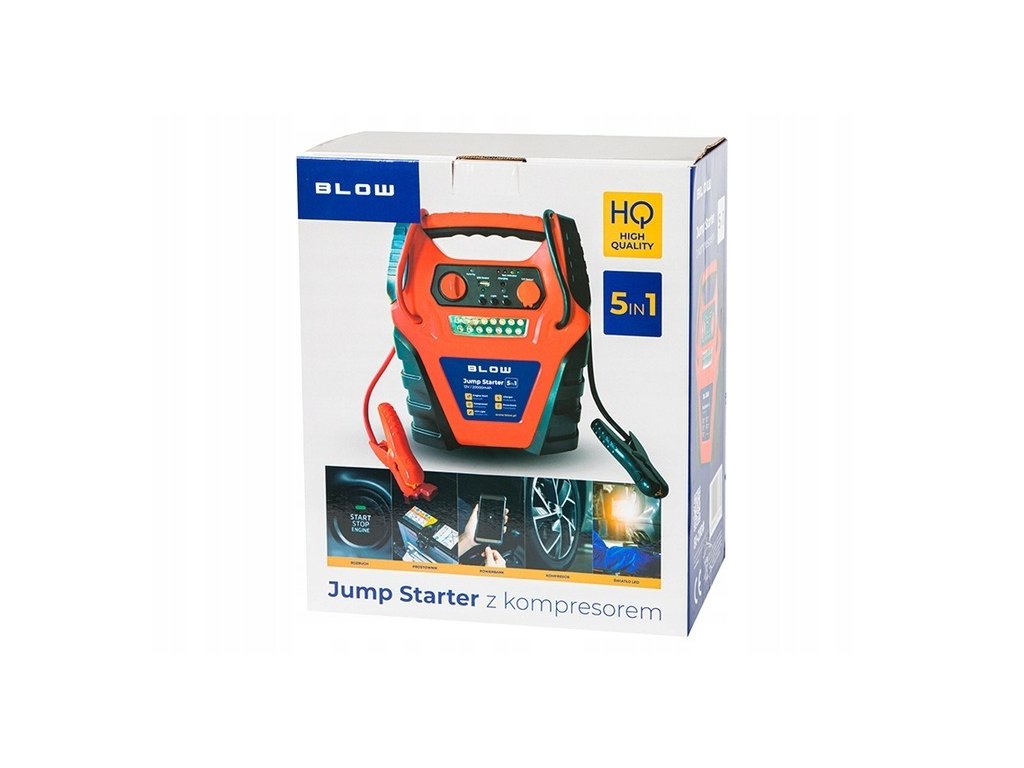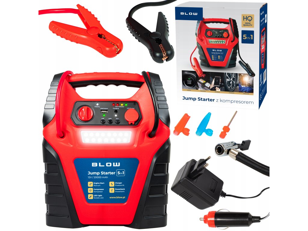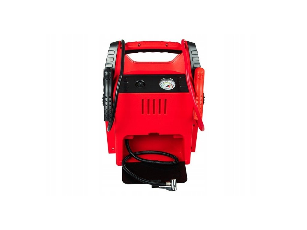 To wyjątkowe źródło rozruchowe posiada również wbudowaną sprężarkę powietrza z manometrem oraz wężyk zakończony zaworkiem samochodowym. Ciśnienie sprężarki wynosi 20 barów / 300 PSI. Dodatkowo to praktyczne urządzenie posiada 3 dysze do pompowania różnych akcesoriów takich jak piłki, materace itp.