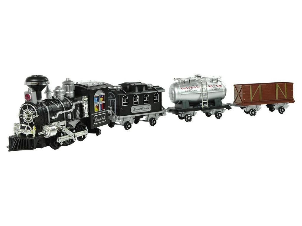- Elementy zestawu: pociąg, wagon osobowy, wagon z silnikiem Diesla, wagon towarowy, 3 proste tory, 12 zakrzywionych torów, pilot zdalnego sterowania, pojemnik na wodę
